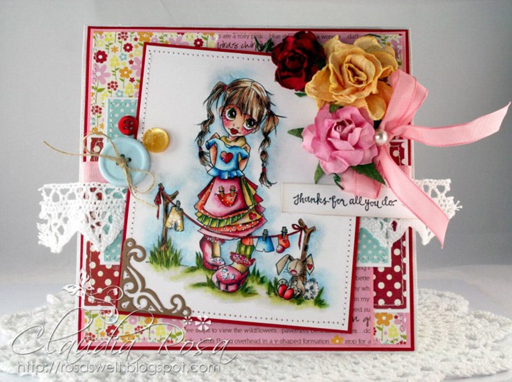 OH!!! Hello Claudia, this is exactly what awaits me tomorrow! after the fun, the work. I love love so much this cute image. your coloring is just fabulous. As I told you, your layering always fascinates me. you select always papers that go magnificiently together. Fantastic card. Hugs.